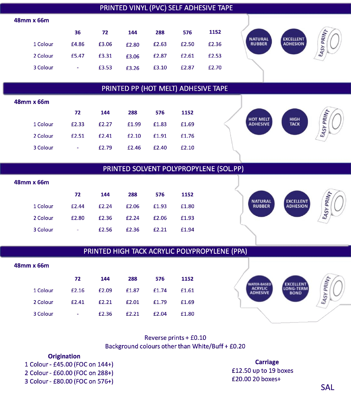 Our printed packaging tapes are available in vinyl, PP (hot melt), solvent polypropylene and high tack acrylic.